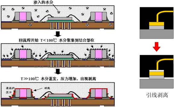 MSD危害发生在焊接过程的回流区,整个器件要在183度以上60-150s左右,最高温度在220-235(SnPb共晶)。无铅焊接的峰值温度、预热温度更高,最高温度在245-260度。在回流区的高温作用下,器件内部的水分会快速膨胀,器件的不同材料之间的配合会失去调节,各种连接则会产生不良变化,从而导致器件剥离分层或者爆裂,尤其对系统集成封装器件内部存在焊锡的封装器件,还会因为水分膨胀挤压导致流锡,发生与相邻器件短路,或原焊接器件少锡断路。于是器件的电气性能受到影响或者破坏。破坏程度严重者,器件外观变形、出现裂缝等,通常我们把这种现象形象的称作“爆米花”现象。过程如下图:
